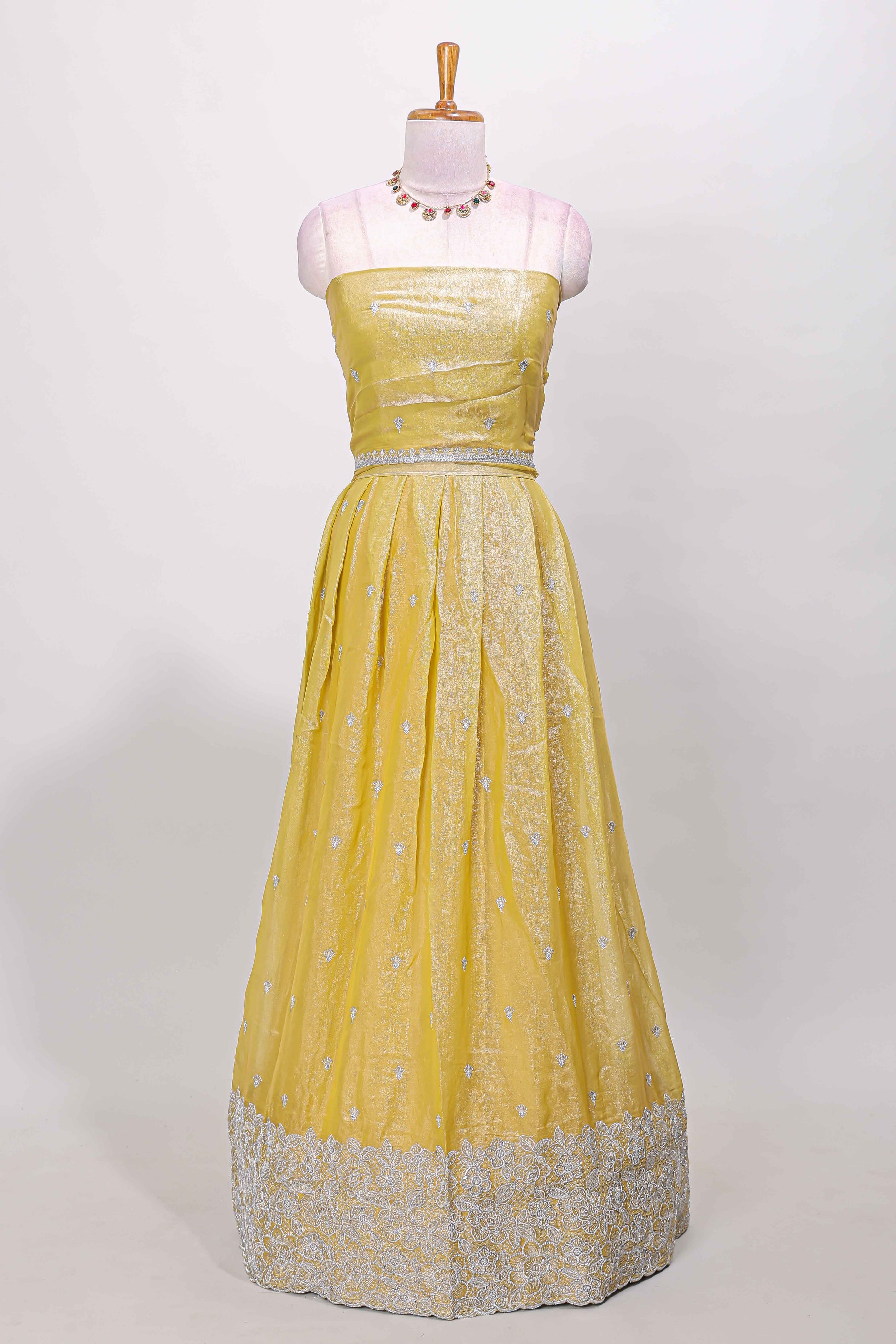 Yellow fendy chiffon lehenga with all over embroidery and stone work, paired with a contrast dhavani