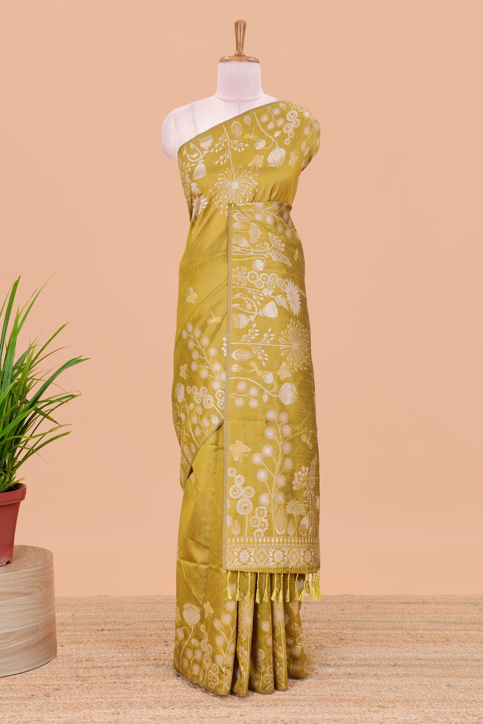 Yellow munga cotton saree with all-over floral thread weaving & motif border
