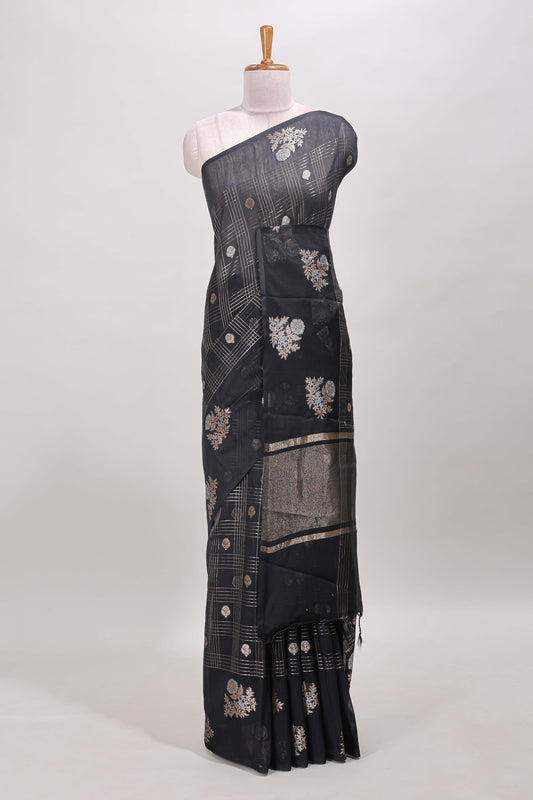 Black checked zari motifs chanderi silk cotton saree with self border and matching striped blouse