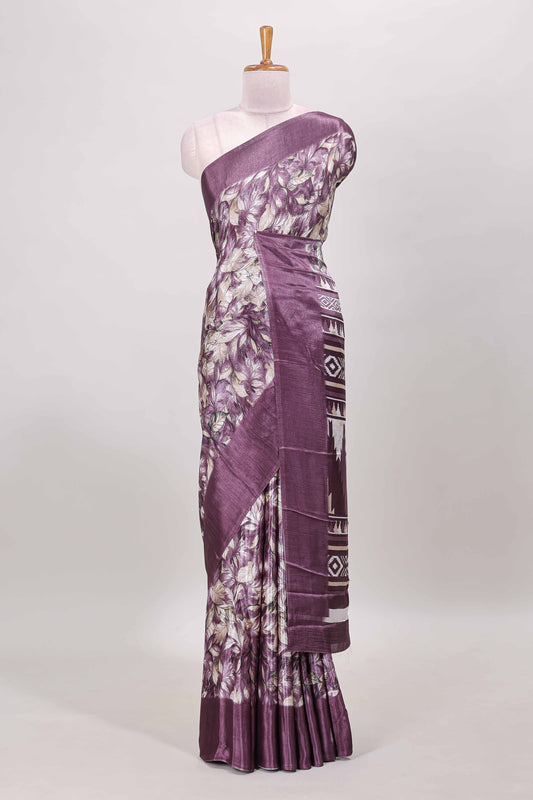 Purple all over leaf print crepe turkey saree with self border and ikkat style pallu