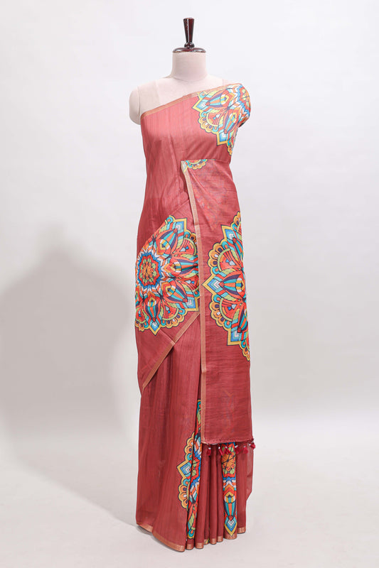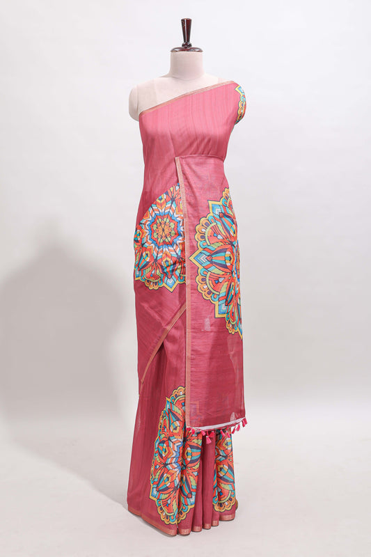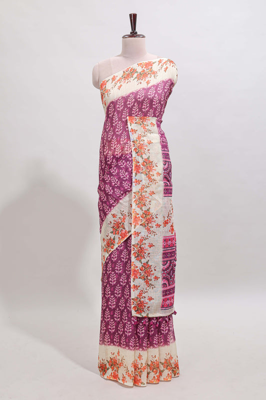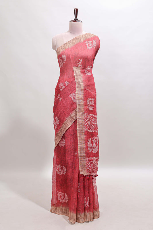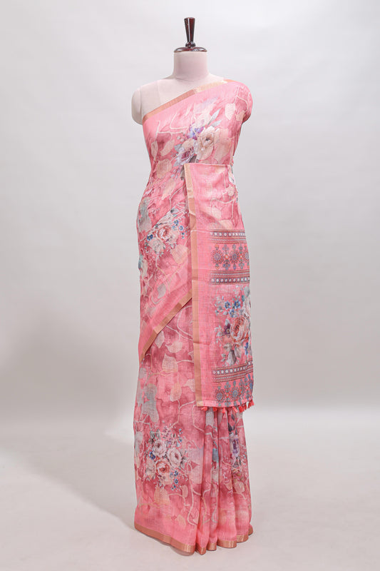 Pink floral design linen cotton saree with self zari border and matching blouse