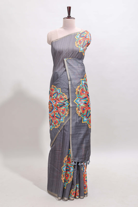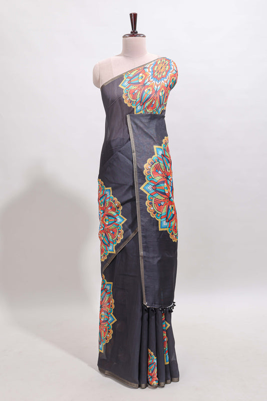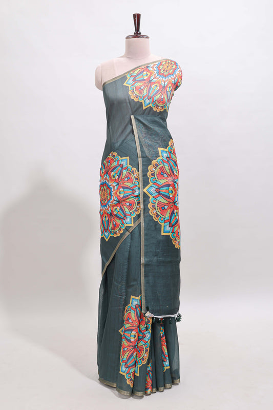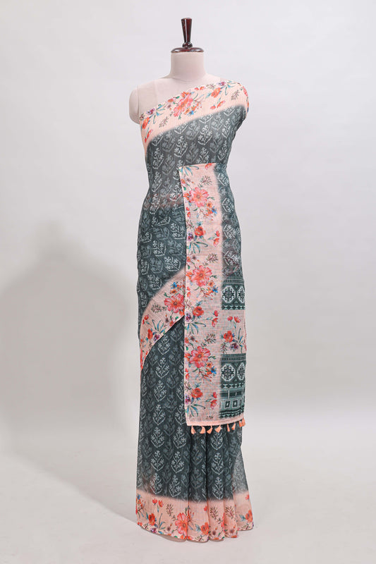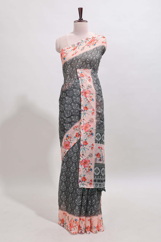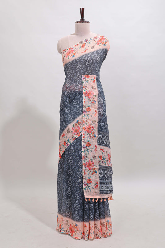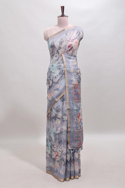 Grey floral design linen cotton saree with self zari border and matching blouse