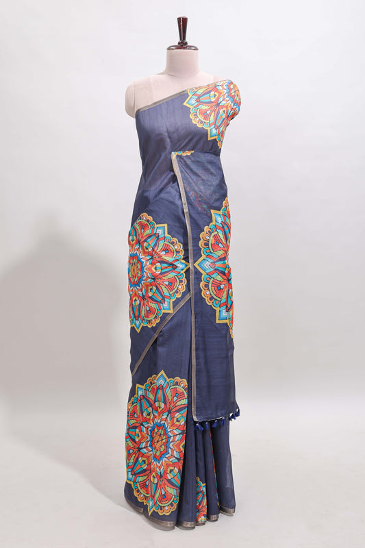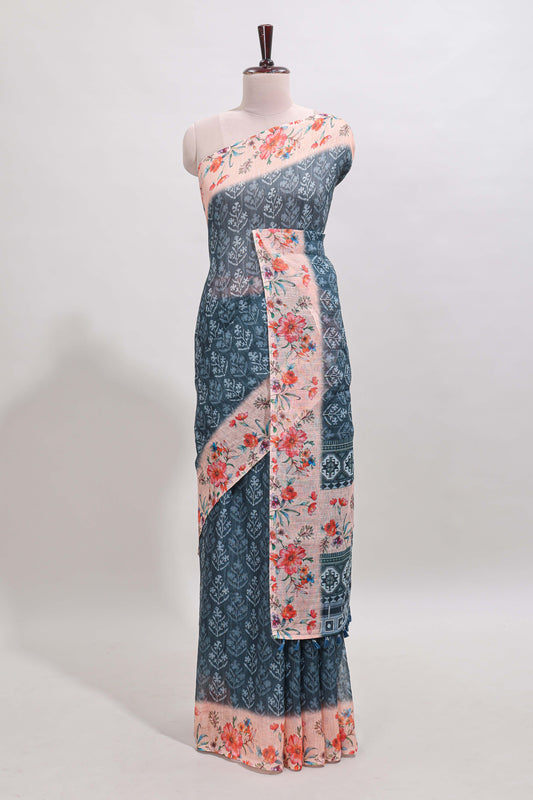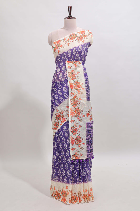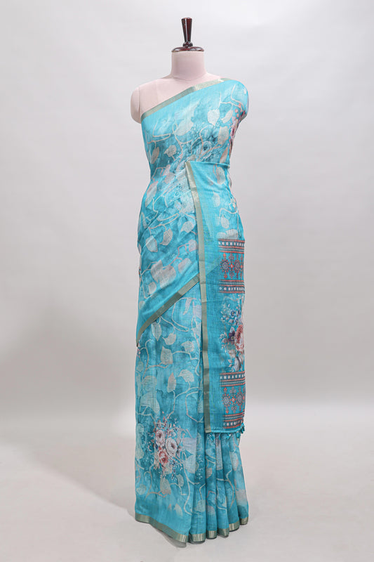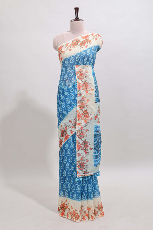 Blue floral design linen cotton saree with self zari border and matching blouse