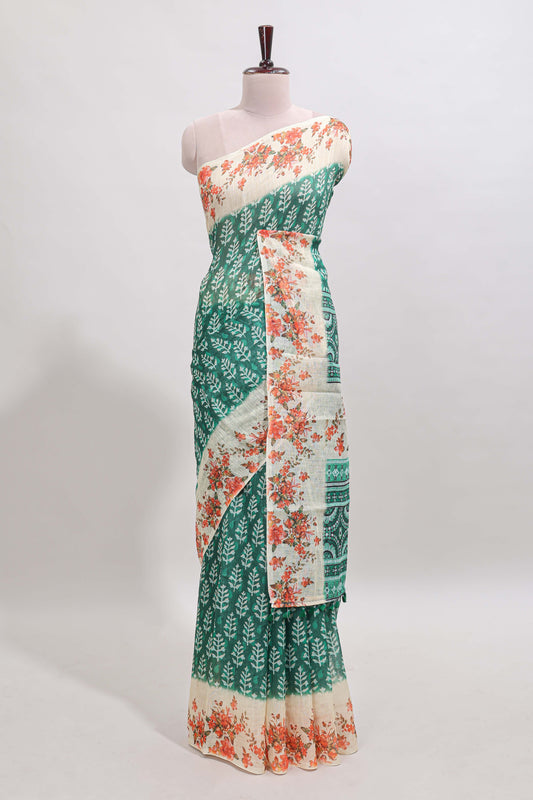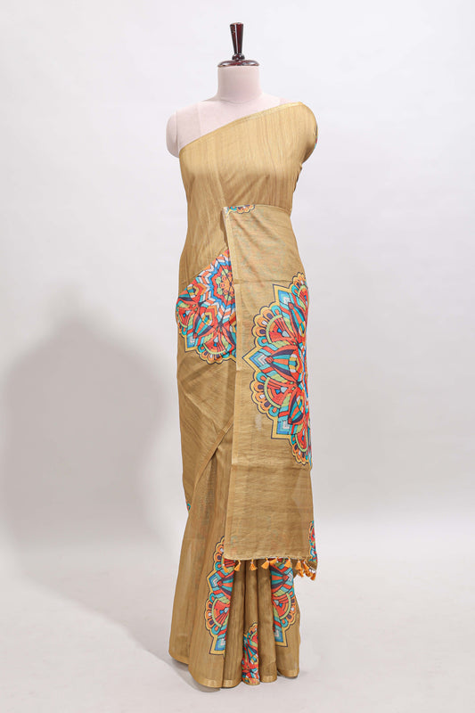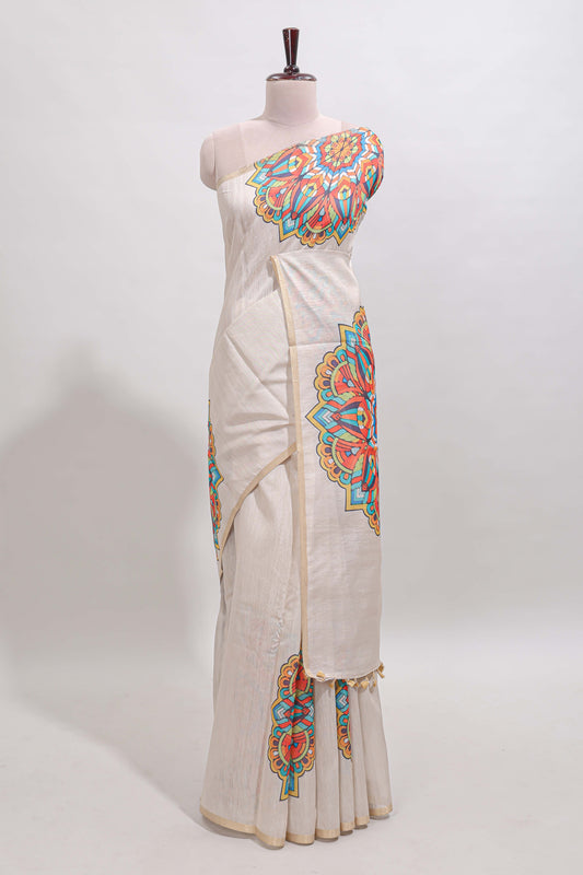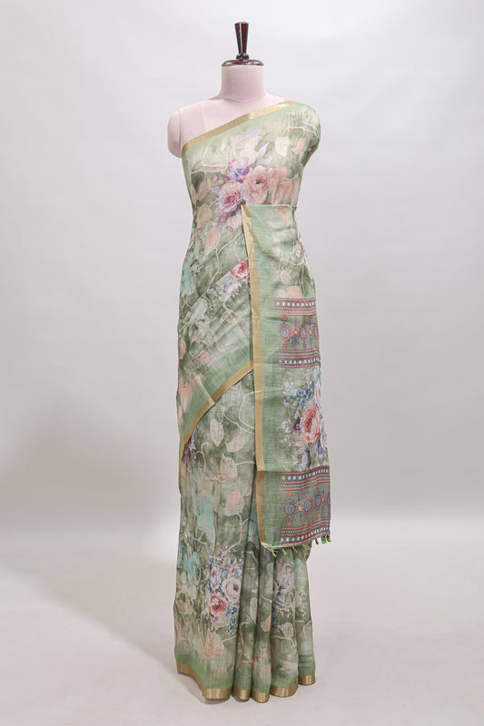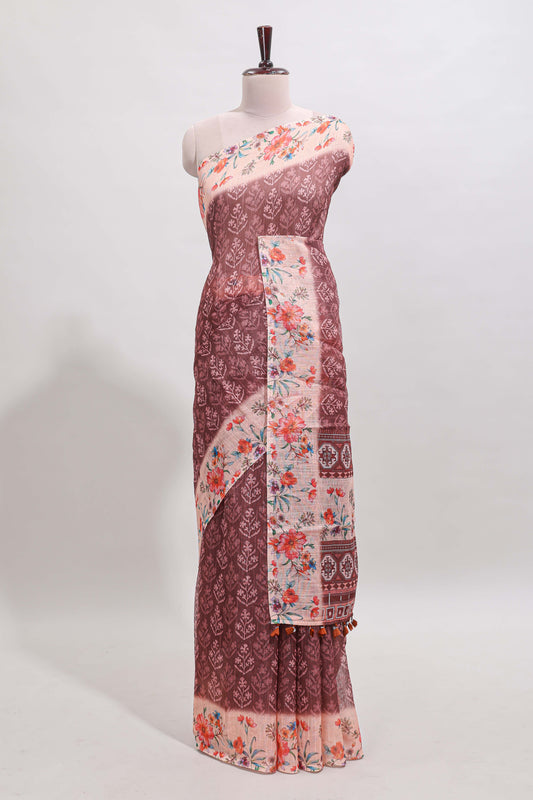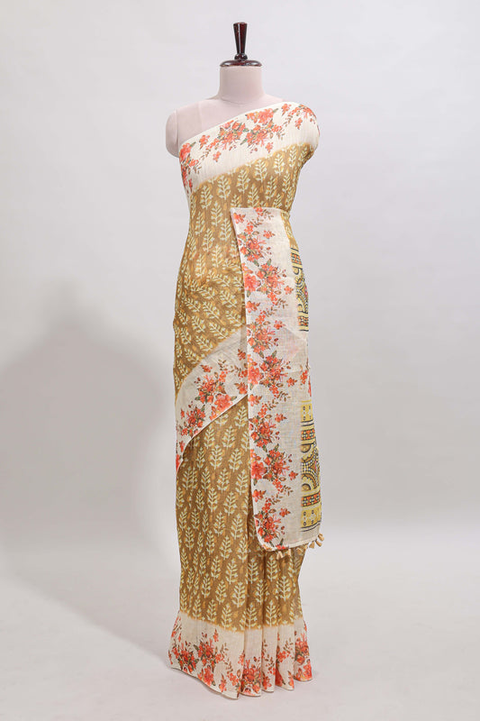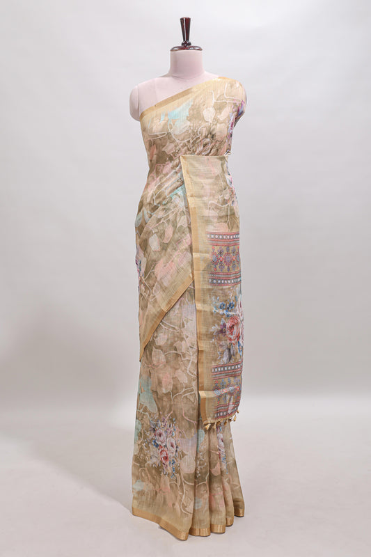 Beige floral design linen cotton saree with self zari border and matching blouse