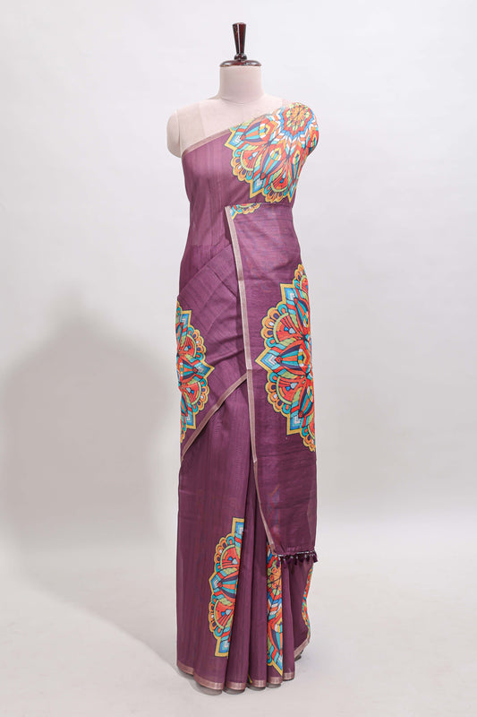 Borderless mulberry purple leaf zari butta and birds design semi soft silk saree with self pallu and matching blouse