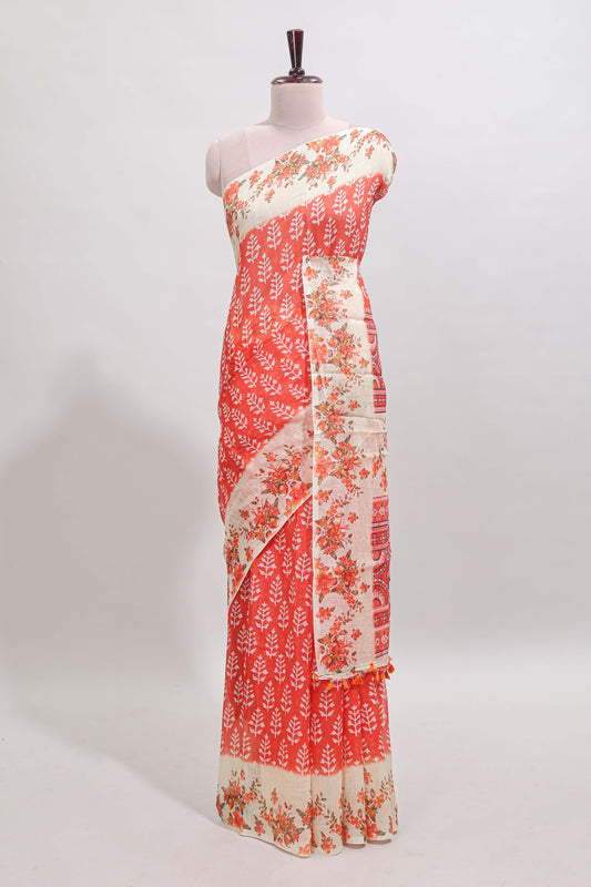 Red peacock & floral motifs linen cotton saree with contrast border and matching blouse