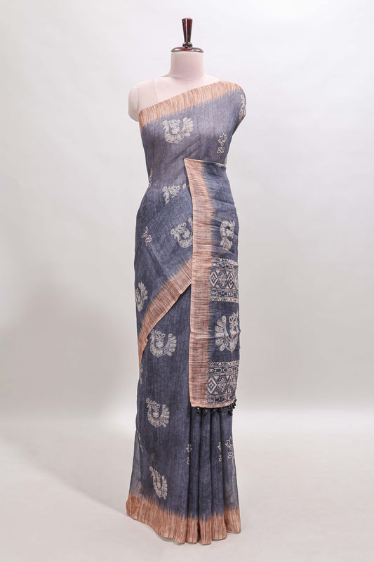 Grey peacock & floral motifs linen cotton saree with contrast border and matching blouse