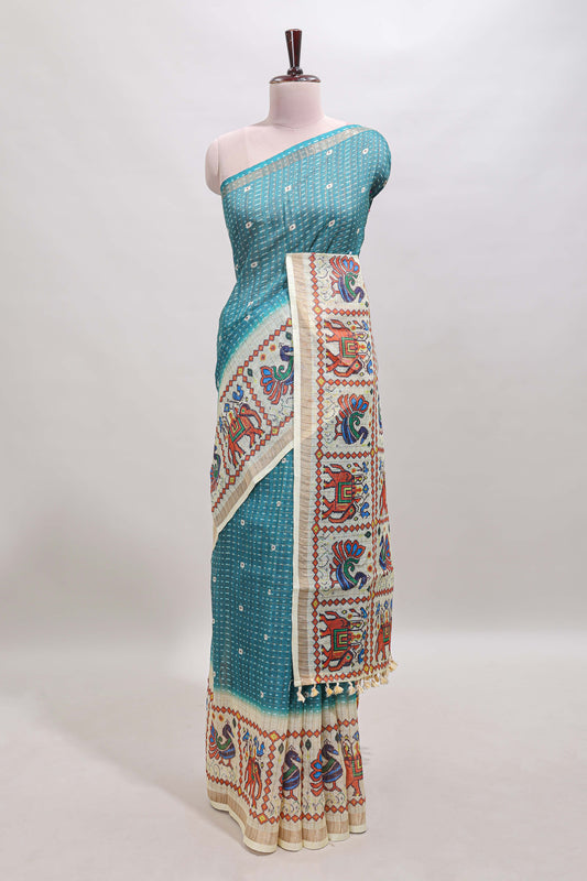 Turquoise blue checked geometric motifs linen cotton saree with contrast ikkat style border and blouse