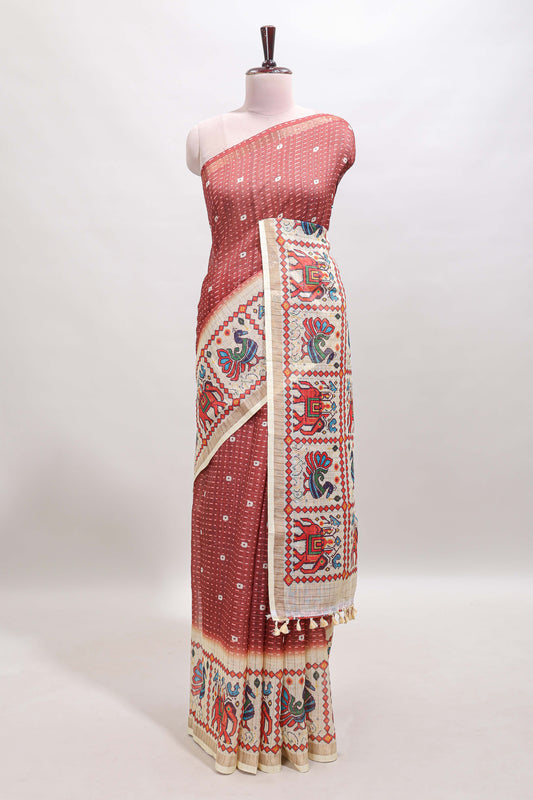 Maroon checked geometric motifs linen cotton saree with contrast ikkat style border and blouse