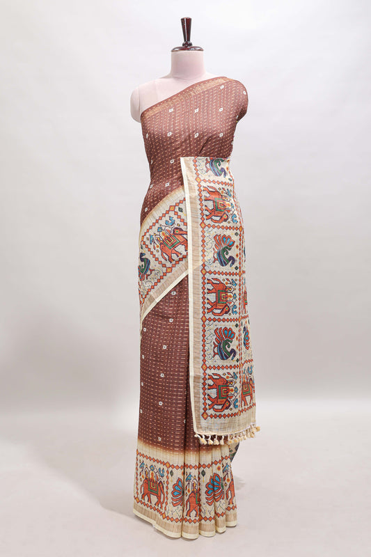 Brown checked geometric motifs linen cotton saree with contrast ikkat style border and blouse