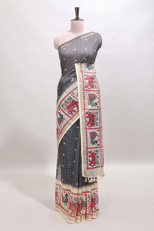 Grey checked geometric motifs linen cotton saree with contrast ikkat style border and blouse