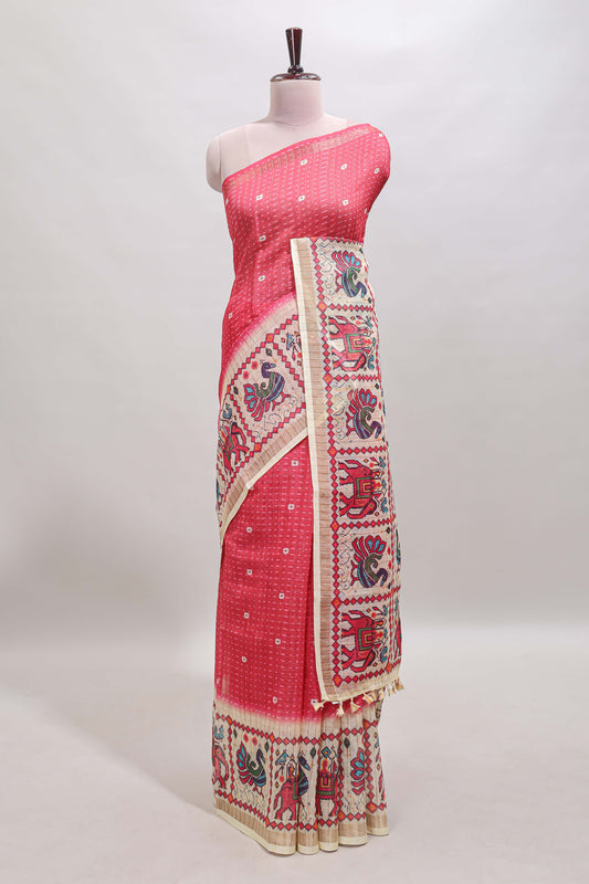 Pink checked geometric motifs linen cotton saree with contrast ikkat style border and blouse