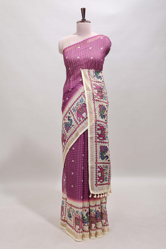 Purple checked geometric motifs linen cotton saree with contrast ikkat style border and blouse