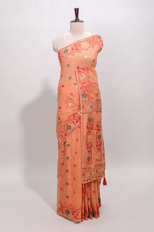 Orange floral motifs munga cotton saree with self border matching blouse